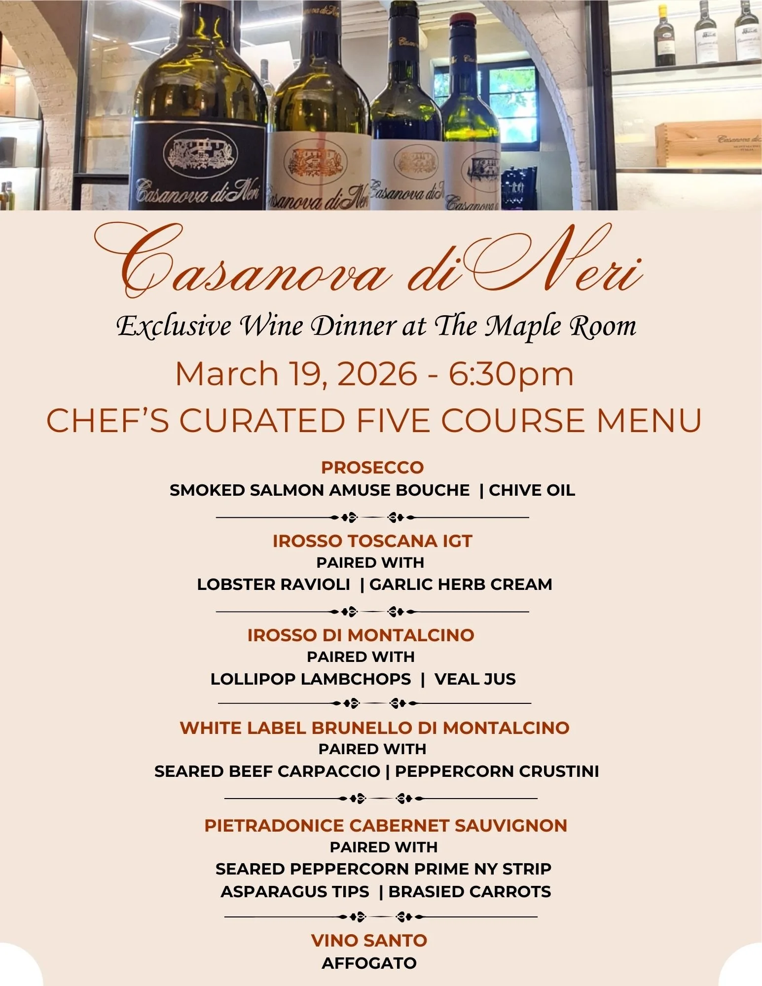 Casanova Di Neri Wine Dinner Thursday, March 19, 2026 6:30 PM 10:00 PM The Maple Room 377 Maple Avenue West Vienna, VA, 22180 United States (map) Google Calendar ICS Click here to purchase tickets: